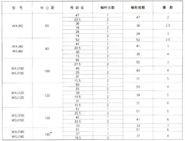 WXJ、WSJ蜗杆减速器的标记包括:型号、中心距、传动比、装配型式。